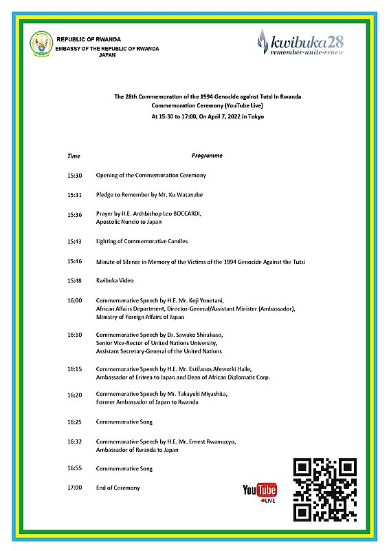 The Embassy of the Republic of Rwanda in Japan, on Thursday, April 7, 2022, invited friend of Rwanda in Japan to join other Rwandans and friends of Rwanda to mark the 28th Commemoration of the 1994 Genocide against the Tutsi in Rwanda.