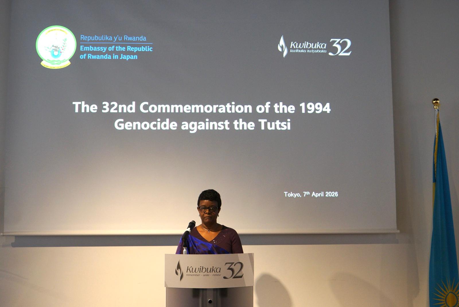 Tokyo, 7 April 2026, the Embassy of the Republic of Rwanda in Japan hosted the 32nd Commemoration of the 1994 Genocide against the Tutsi (Kwibuka32) at the United Nations University in Tokyo, bringing together senior government officials, members of the diplomatic corps, scholars, and the Rwandan community in Japan. The ceremony served as both a solemn tribute to the victims and a renewed call for global vigilance against genocide and its underlying ideologies. In her keynote address, Ambassador Marie Claire Mukasine emphasized that Kwibuka goes beyond remembrance, calling for responsibility and action in preserving truth and preventing future atrocities.