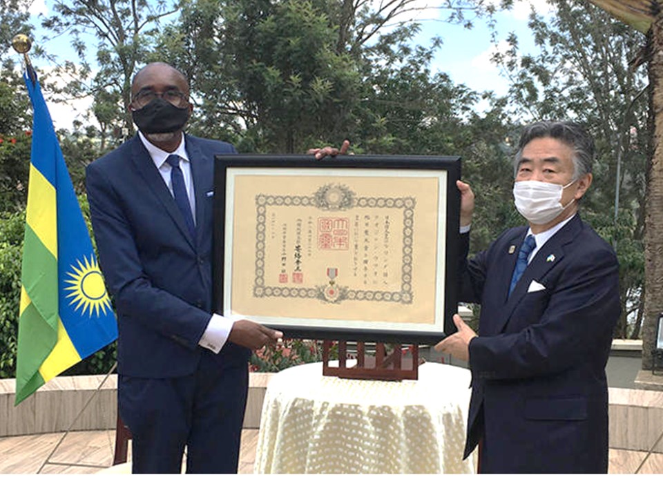 今井雅啓在ルワンダ日本国特命全権大使は、ルワンダで空手の普及に貢献した経験豊かなテオジーン・ウワヨ氏に旭日双光章を手渡しました。
