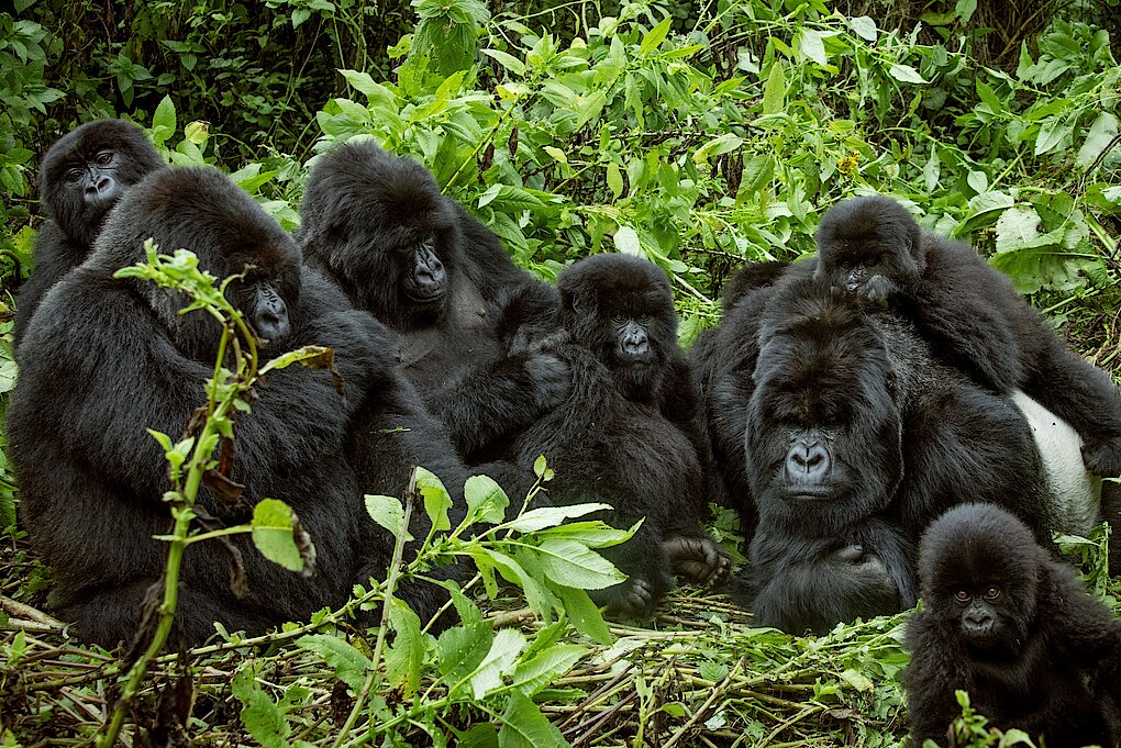 メスと子どもたちがオスを取り巻く典型的なゴリラのハーレム写真